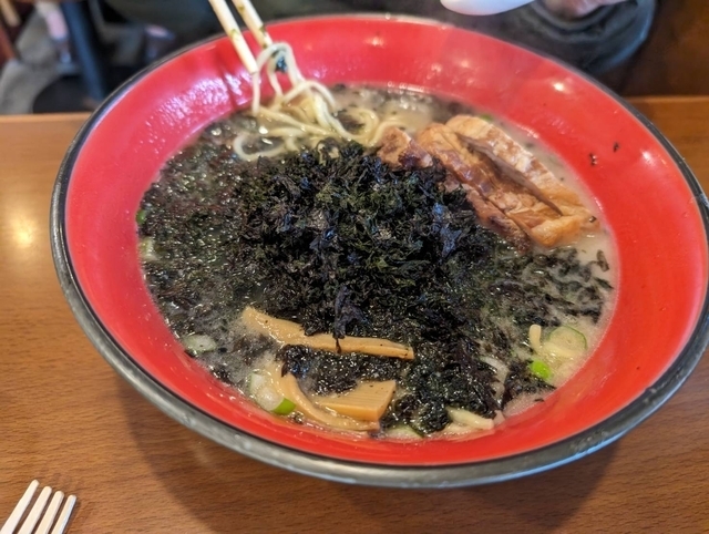休日に行くと満席、待ち客も外に出そうな人数。せっかくなので20分程待って、岩のりラーメンいただきました。 量もしっかりあり、美味しかったです。