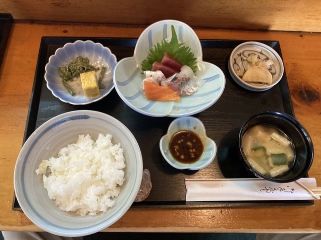 久しぶりに訪問。 山菜天ぷら食べたくて訪問したが、まだ準備中との事。刺身定食に変更。刺身6点盛りで700円。以前はワンコインでやっていたが、各種値上げの為、200円アップしたとの事。それでもコスパいいよね。 焼きたて、炊き立て、切り立て、揚げたて がモットー。そのため少し待ちます。 シニア向けに御飯柔らかめに炊いてくれているのが嬉しい。ちなみに御飯はおかわり自由との事。