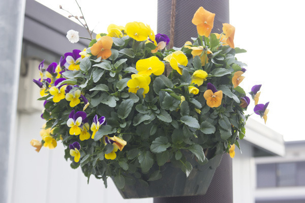 商店会の街灯には丁寧に手入れされた花が飾られています。