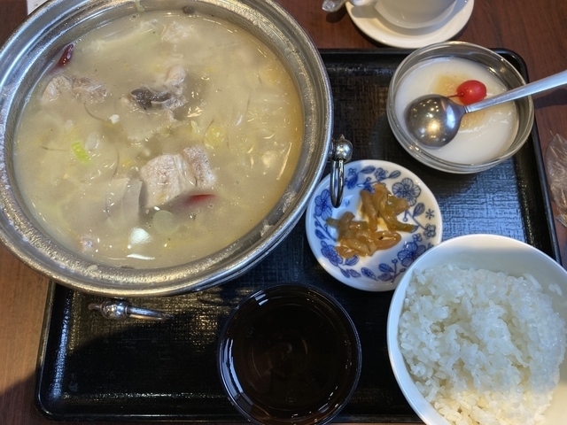 初めて平日夜に訪れると、ほぼ満席という盛況です。楼外楼Bivi支店の限定メニューとして、シェフのおすすめ鍋フェアというのをやっており、その内から「酸菜魚片湯」(高菜と白身魚の辛煮鍋、ライス・漬物(搾菜)・デザート付)をいただきました。また併せて前菜の豆苗炒めを霧筑波とともに追加。豆苗炒めは豆苗のほか、タケノコ細切りとパプリカを合わせて旨塩出汁で炒めたもの。ショウガかニンニクで下味を付けてるようで、酒肴としてかなり美味しい。酸菜魚片湯は一人用のステン鍋一杯に塩出汁スープが張られ、鍋下に設えた固形燃料の火でグツグツ煮立っています。具は高菜に白身魚(タラ?)とたっぷりの春雨。刻み鷹の爪が浮かび、ショウガの味わいと高菜の酸味、それにピリ辛を感じる塩ベースのスープが実に美味しい。食べ進めるうち、辛さで自然に発汗し、ライスがちょっと足りないくらい。デザートの杏仁豆腐(サクランボ添え)で口直しし、満足しました。