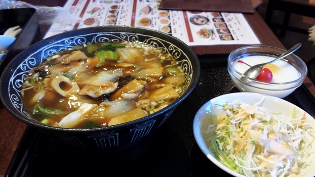 ランパラの五目やきそばを食しました。メインの他にサラダ小鉢(キャベツ/水菜/ニンジン)、中華スープ(とろみある清湯のかき玉/ワカメ/ニンジン/豆腐)、デザートの杏仁豆腐、お替わり可のコーヒーが付いており、価格の割に過分な量でお得なセットでした。五目やきそばの餡は、豚バラ肉/海老/イカ/白菜/木耳/マッシュルーム/青菜/タケノコ/ベビーコーン/ニンジン/ウズラ玉子と具沢山で、かつ餡の味も良く、これはまた食したいと思える内容でした。