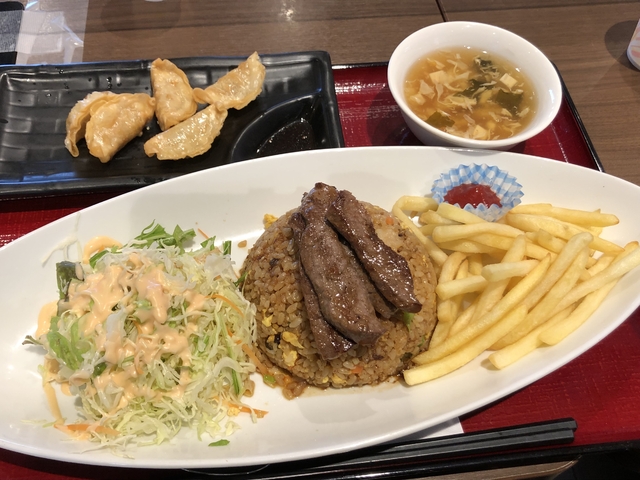 メニューが沢山あって迷いましたが、ステーキ炒飯を頂きました。店員さんが店頭でサービス券を配布していて、揚げ餃子は無料サービスでした。コスパ最高です。