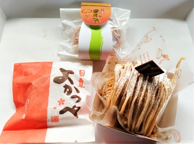 今回は栗を使ったお菓子を購入してみました。 【茨城栗のモンブラン¥430】…クリームの中に少しですが、栗が入っています。 【日立よかっぺ¥130】…粒餡と栗が入った焼菓子。 【栗元気¥180】…渋皮栗と白あんが入ったパイ饅頭。 どのお菓子もおいしく、価格もそれほど高くなかったので、佳かったです。