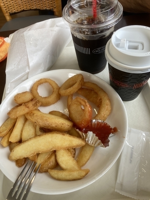 バーガー類は550円からなので、ちょっとお高いかと思いましたが、旦那が食べたメンチカツバーガー550円はとても食べ応えあり、美味しかったようです。コーヒーもサザコーヒーでホットとアイス両方あり、一休みするのにはもってこいです。写真のポテト&オニオンフライもボリュームあり。ゾウさんを見ながら一休みなんてなかなかいいもんですよ。