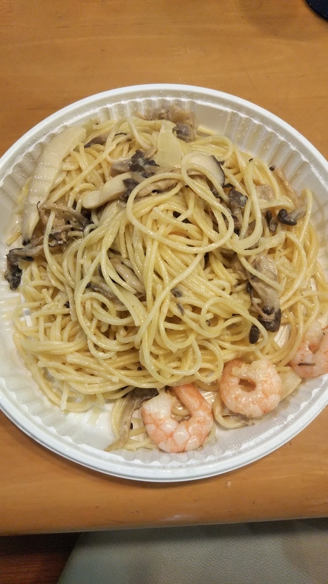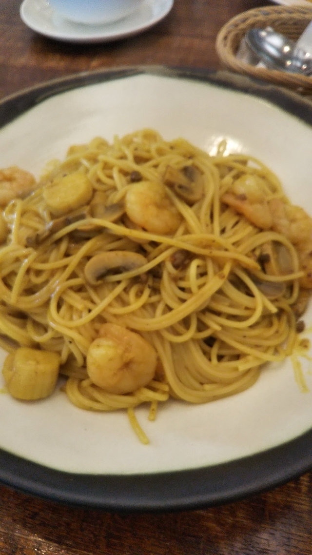 メニューがたくさんあって困ります。 端末でオーダーできるのは便利ですね、写真付きなので選ぶ参考になるし。 今回は食べたことないエビと貝柱のパスタ、ドライカレー味を頼みました。 美味しいけど、ドライカレーの味が強すぎてチーズやタバスコでは味変できなくて。