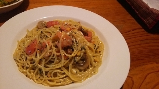落ち着いた雰囲気でゆっくりできました メニューはやっぱり迷いましたが1回頼んだことのある海賊スパゲティに♪ セットのサラダは海老にパミストラが入っていて豪華でした!
