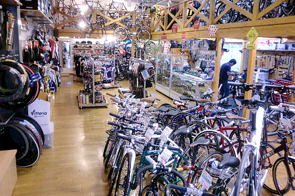 広い店内には豊富な自転車はもちろん、シューズ、パーツ、ウエアーやヘルメット、サングラス、メンテナンス用の工具やサプリメント食品など自転車に関する用品でしたら、一度に揃う豊富な在庫が自慢です。ぜひ一度ご来店ください。お待ちしています。