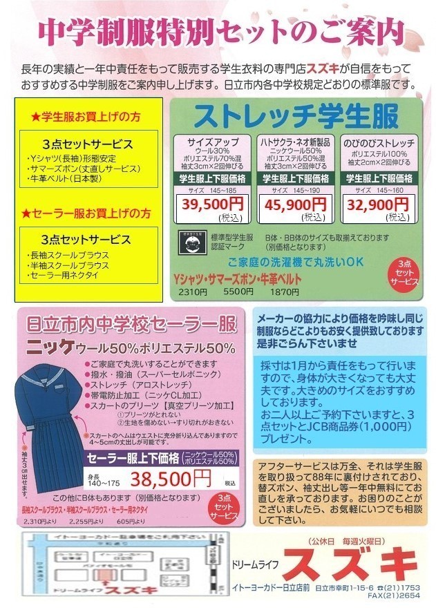 『ドリームライフスズキ』では中学・高校の制服を、1年中責任を持って販売しております。