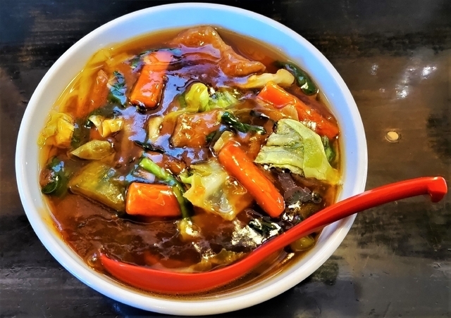 本場スタミナラーメン多幸はご当地ラーメンであるスタミナラーメンのお店です。昔ながらのさっぱりした鶏ダシスープをベースに、ちょっと甘目で焦げの香りが芳ばしいのが特徴的。特にとろ~んと仕上げた甘辛あんは多幸ならではの仕上がりです。先に甘辛あんを仕上げてからざく切りでゴロっとカットしたたっぷり野菜を絡めるので、野菜のシャキシャキ感は特筆!また、カボチャのホクホク感を大切にしたいので、カボチャは特に大きめにカットしています。対してレバーはしっかり臭みをとれるように薄切りで素揚げして、香ばしく、でも枚数を多くトッピングしています。麺は水戸のワタナベ商事のぷるぷる中太麺。しなやかな弾力が持ち味です。