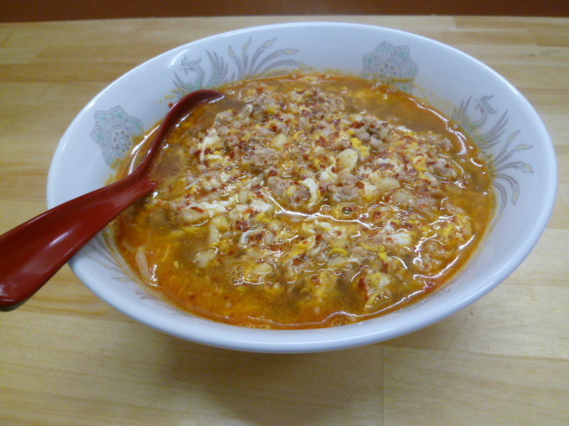 ラーメンは、挽き肉と唐辛子をたまごであえたものが麺の上に乗っている。 あまり見たことのないビジュアル。 麺は太めのたまご麺。 スープは、そこまで辛くなく、にんにくの風味が悪くない。 ごちそうさまでした。 店が目立たないところにあるんで、そこを改善できれば、このてのジャンルはこのエリアではないので、そこそこ流行るかも。