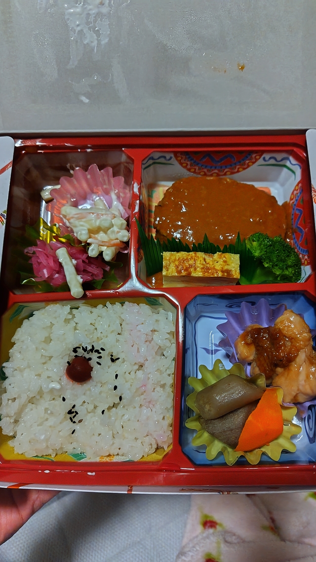 ボリューム満点のお弁当です!お肉以外にもお魚のお弁当がありました!お肉はハンバーグです。拳よりも大きくて、驚きました。とっても美味しかったです。