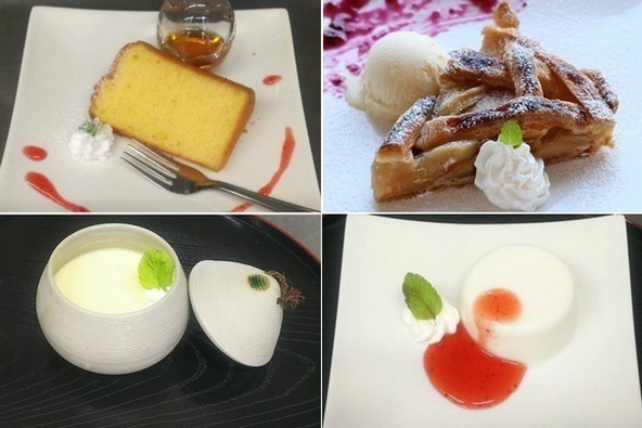 はちみつプリン 390円 ・パンナコッタ(ゼラチン使用) 360円 ・アップルパイ 480円 ・女将のパイ 550円 ・シフォンケーキ 420円 ・バニラアイス 250円 ・デザートセット 750円 デザートにコーヒー又は紅茶のセット(※ホットコーヒーはおかわり1杯無料)
