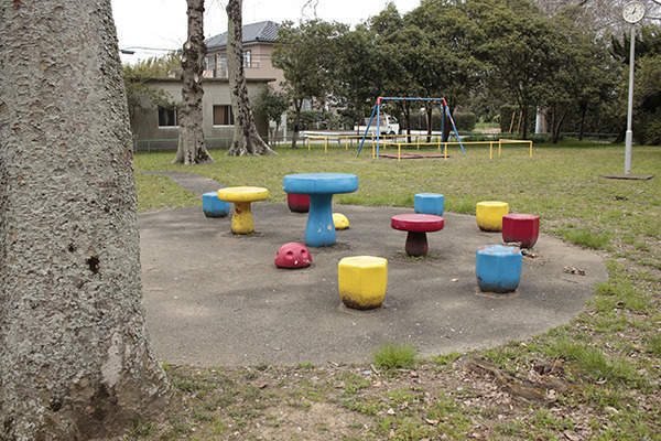 薄緑色の門が特徴的な公園。周囲を豊かな木々で囲まれた、2,400㎡ほどの敷地面積を有しています。園内は一面に芝生が敷かれていて、トイレと水のみ場が完備されています。置かれている遊具は、すべり台、ブランコ、鉄棒の3種類。公園のほぼ中央には、赤・青・黄色のユニークな椅子と台座が置かれ、公園のシンボルとなっています。敷地は平坦で、遊具スペースと芝生広場が分かれているため、用途によって使い分けられる、利用しやすい公園となっています。大きな木が立ち並び、周囲にも豊かな緑があるのも同公園のうれしいポイントです。