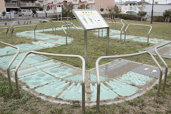 広い芝生と築山のある公園。遊具もユニークなものばかりが揃っていて、種類はスプリング遊具、ネット遊具、複合遊具、大きなタイヤブランコとなっています。そして、何といってもこの公園の特徴は、「健康快道」と呼ばれる道があること。くねくねとカーブした道の下に、でこぼこの足つぼを押す板が設置されていて、歩くだけで足つぼマッサージの効果が得られるというアイデアアイテムです。道に沿って手すりも付いているのもうれしい心遣い!もちろん、トイレや水のみ場などの公園になくてはならない設備もあり、さまざまな年齢層の人が喜ぶ設備が整っています。