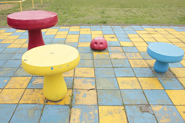 赤・青・黄色の椅子とカラフルなタイルは公園のシンボルとなっています。