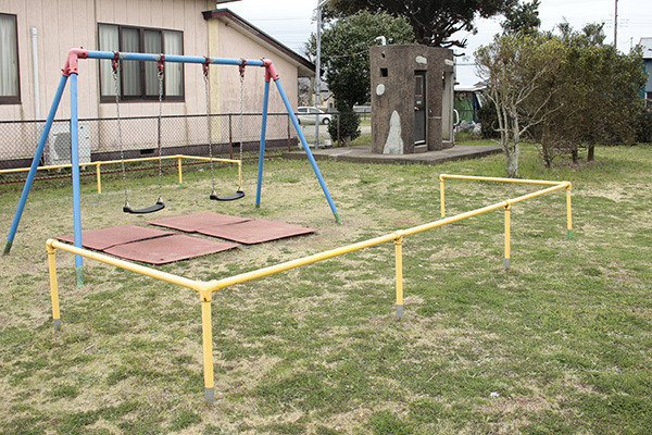 芝生面に置かれた定番遊具のブランコ。その奥には水洗トイレが設置されています。
