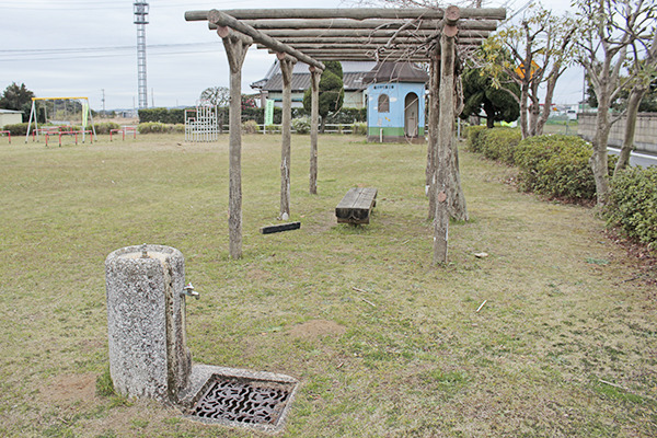 民家と畑に囲まれた児童公園。敷地面積は2,400㎡ほどの広さです。石造りの門を入ると外套があり、芝生の敷かれた幅広い用途に使えるスペースが広がっています。設置されている遊具は4種類で、すべり台、ブランコ、鉄棒、小規模なジャングルジムが置いてあります。公園のシンボル的な設備として、ユニークな水洗トイレがあります。園内の隅に置いてあるトイレは広く、壁にはタヌキやヘビ、カンガルーにウサギなどの愛らしい動物の絵が描かれています。その他にも、ベンチが3基と水のみ場が設置されていて、来園者が利用しやすい公園となっています。