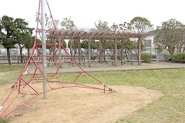 うずも児童公園は、神栖第三中学校のすぐ目の前にあります。敷地面積はおよそ2,500㎡。奥行きはあまり無く、東西に広がる形をしています。公園沿いの通りは当然スクールゾーンですが、車通りは多めなので子どもを遊ばせる際には注意が必要。水洗トイレ、水のみ場、大型のパーゴラ下には8基のベンチが並んでいます。設置されている遊具は5種類。まずは定番のすべり台、ブランコ、鉄棒。残りの2種類は、ザイルクライミングと多目的に利用できるアスレチック遊具。遊具遊びが好きな子どもは、きっと本公園を気に入ってくれるでしょう。