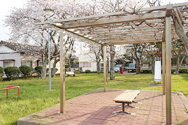 神栖市知手中央の住宅街に位置する、600㎡ほどの小さな公園。入り口は階段になっています。正面には金属製のパーゴラが建っていて、その下には柔らかい色合いのベンチが1基。トイレと水のみ場もありますので、休憩所として利用できる公園です。トイレは外装が木で造られている和式の水洗トイレで、内部が非常に清潔!気持ちよく利用することができます。置かれている遊具はすべり台とブランコの2種類。敷地が広くないので、広々としたスペースを活用する公園遊びにはもの足りないかもしれませんが、本園は何といっても桜がきれい!園内には7本の桜の木が植えられていて、春には小さな公園が見事な花見スポットに変身します。
