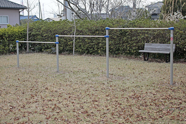 引き締まったカラーリングの鉄棒。後ろの木々の奥は芝生広場となっています。