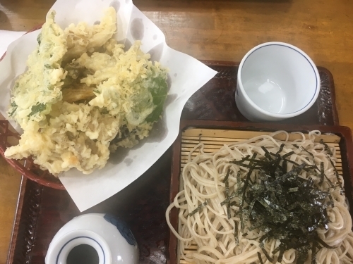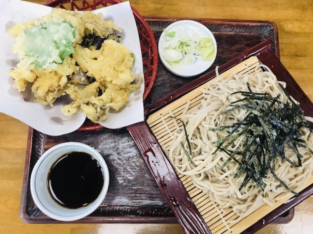 隣の方が食べているのを見て同じものを注文。 「まいたけ天ぷら」の冷たいお蕎麦。 ボリュームあり。「まいたけ」だけでなく、他の天ぷらも少し入っているのでいいですね。2名以上で行くならシェアしてもいい。