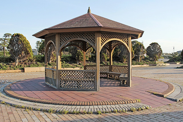 休憩所として利用できるあずまやは、建屋の内部にベンチが置かれています。