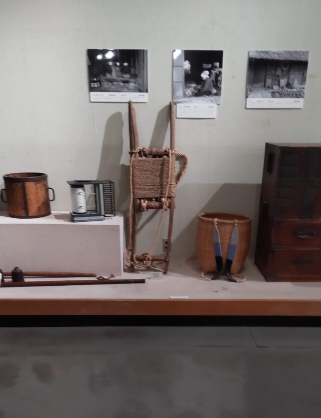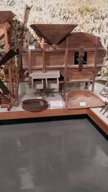 私が子供のころは、日常普通に使っていた品々が、たくさん展示されていて、懐かしく見いってしまいました。写真のとうみ、家の庭で使ってました。黒の足踏みミシン、しょいかご、日立製の初期の電化製品、特にチャンネルを手で回す白黒テレビなど、昔の生活がよみがえってくるようでした。
