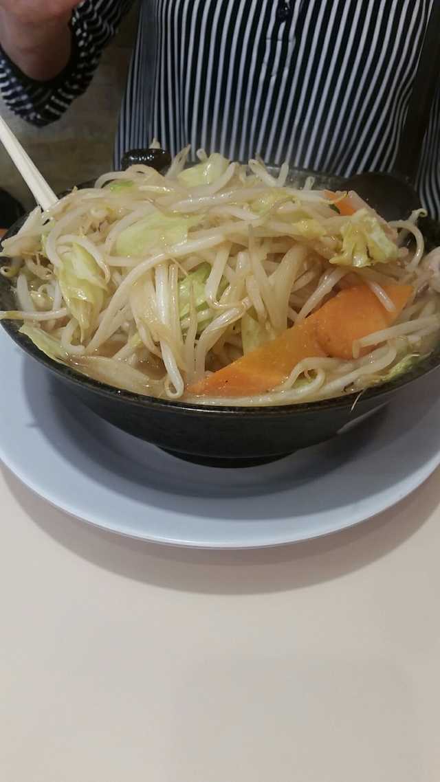 店員さんも元気が良く、気持ちがいい。 旧石下のす○○のさん系列なので、無難な味噌をオーダー。 約8分後、着丼。 具はモヤシやタマネギ、青ネギを刻んだもの。 スープは若干ニンニクが効いていてうまい。 人と会う予定がある人は、ニンニク抜きをおすすめします。 麺は気持ち少なめな感じ。 ただ気になったのが、店内が喫煙可であること。 喫煙者には食事後のいっぷくは美味いかもしれませんが、非喫煙者から言わせていただくと食べる前に少しでも煙やニオイが気になる。 出来れば喫煙は店外でして欲しく、店側にもリクエストしたいと思います。 それ以外は言うことなし!!!