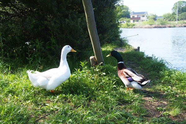 なんと!冬の白鳥飛来だけでなく、アヒルやカモが、このように湖畔をヨチヨチ歩いていますよ♪