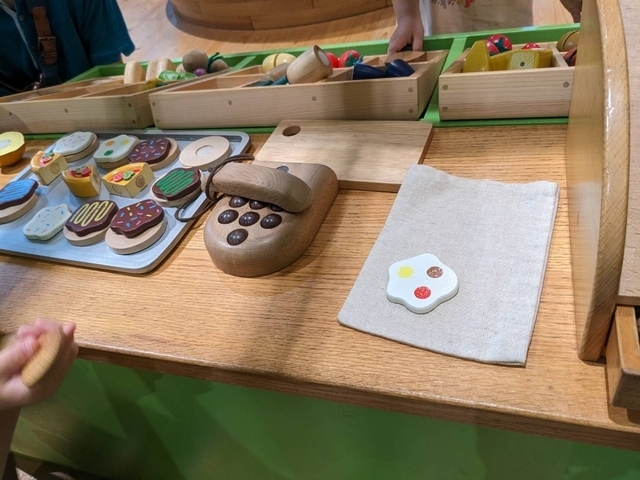 木でおままごとやお会計が出来るコーナーもありました。多くの食材に、お弁当箱やレジスター、お買い物かごに炊事場など揃っていてずっと遊べそうです。