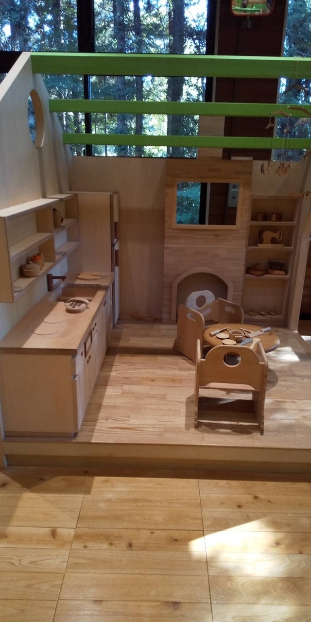 木でおままごとやお会計が出来るコーナーもありました。多くの食材に、お弁当箱やレジスター、お買い物かごに炊事場など揃っていてずっと遊べそうです。