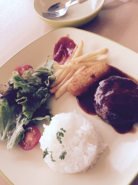 子どもとランチ。キッズランチは500円位でサラダやハンバーグのワンプレートとドリンク・アイスのデザートがつくのでお得。量も多すぎず少なすぎず、5歳息子はちょうど完食できた。