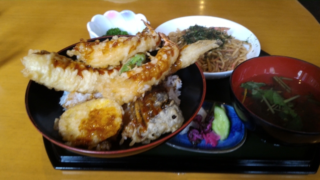 那珂湊焼きそばを食べるつもりで訪問。セットメニューの誘惑にまけ、天丼セットに変身。写真の奥に見えるのが、有名な那珂湊焼きそばです。もっちりした食感です。