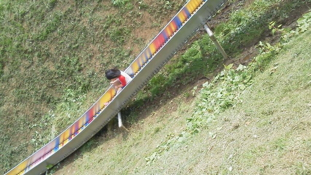 長~いローラーすべりだいがありますよ。 ダンボールとかの敷物がないとお尻が大変なことになります。ワタシは皮が剥けて大変でした。 敷地が広いのでゆっくり散歩するのもいいですね。