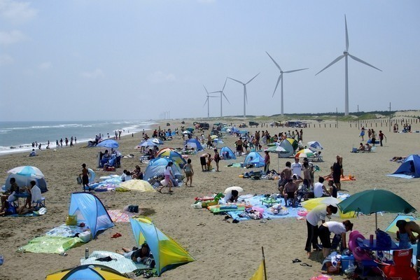 海岸線に立ち並ぶ巨大な風車が目印の海水浴場です。広い砂浜の眺めのよさが人気で若者から子ども連れのご家族まで様々な年齢層の海水浴客が訪れます。駐車場が無料なのもうれしいポイント♪