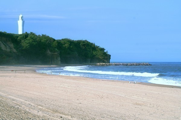 白い灯台と広々とした砂浜、遠浅で透明度の高い海が美しいコントラストを見せる久慈浜海水浴場。