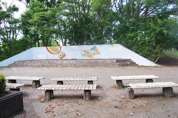 公園入り口の横には、小さなステージと観覧用のベンチもあります。ちょっとしたイベントスペースですね。