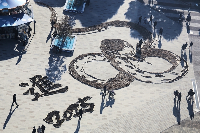 干支の巨大地上絵。⼤観覧⾞に乗車しないと、その全容が分かりません。 巳年にちなんで八の字にとぐろを巻いた巨大な蛇でした。 11月にみはらしの丘で刈り取ったコキアなどの自然素材が材料だそうです。 春休みのためか家族連れが多く見受けられました。
