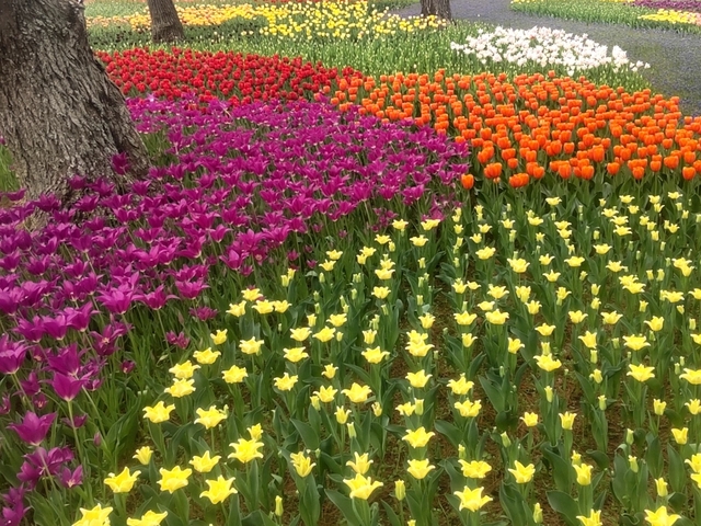 曇っていましたが、お花は元気いっぱいに咲いています。チューリップがとてもたくさんあって、驚きました。観覧車やアトラクションも豊富。想像以上に楽しむことが出来ました。