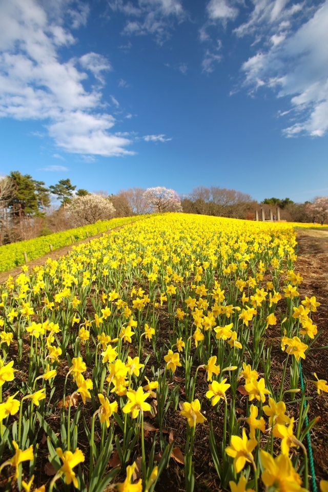 スイセンの丘には早咲きスイセンが満開です。 この時期は、梅の花とのコラボレーションが楽しめます。 西口・翼のゲートから入場するのが便利です。