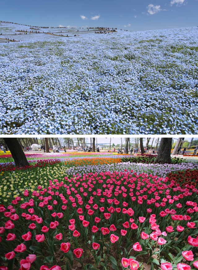 ネモフィラとチューリップが見ごろになりました。 金曜日なのであまり混雑はしないかと思いましたが、海浜公園前の道路は上りも下りも渋滞でした。 砂埃が舞うほどに風が強い日でしたが、みはらしの丘のうねり・空の青さ・ネモフィラの青さがマッチしていてとても素敵でした。 土産物屋さんやトイレも大変混雑していました。