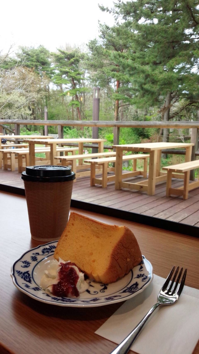 記念の森レストハウスで、 シホンケーキをいただきました。 コーヒー450円 ハーブティー500円 エスプレッソ350円 キャラメルラテ500円 シホンケーキイチゴソース550円 などメニューも豊富。 ソフトクリームもあります。