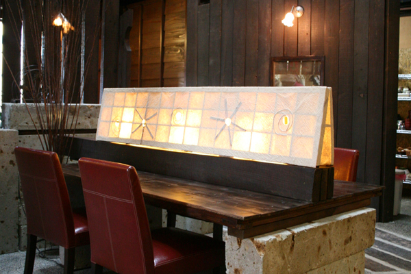 高さ8メートルの吹き抜けが開放的な店内。心地よいジャズが流れ、大谷石、古材、間接照明がモダンな和空間を演出。友人同士やカップル、あるいは一人でもゆったりとくつろげます。メニューは、ランチ3種、カフェセット、コーヒーなど。黒米を使った丼ぶり、グレープシードオイルで上げた春巻き、野菜たっぷりのスープなど、厳選食材を用いた体にやさしい料理を提供しています。ドレッシング、ソース、デザートにいたるまですべて手づくりに徹しています。