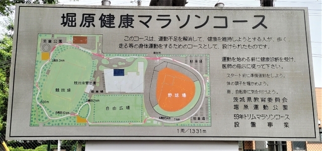 【堀原健康マラソンコース】 公園内を大きく周回するコースが設定されています。1周1331m。マラソンだけでなくウォーキングとしてもおすすめです。ただ、野球場外周及び武道館前は車道となっているので注意が必要です。野球場外周には歩道がありますが、樹木の根が歩道を押し上げているのでデコボコしています。 樹木で日陰が多いので、日差しが強いときでも、幾分涼しく感じながらウォーキングできそうです。