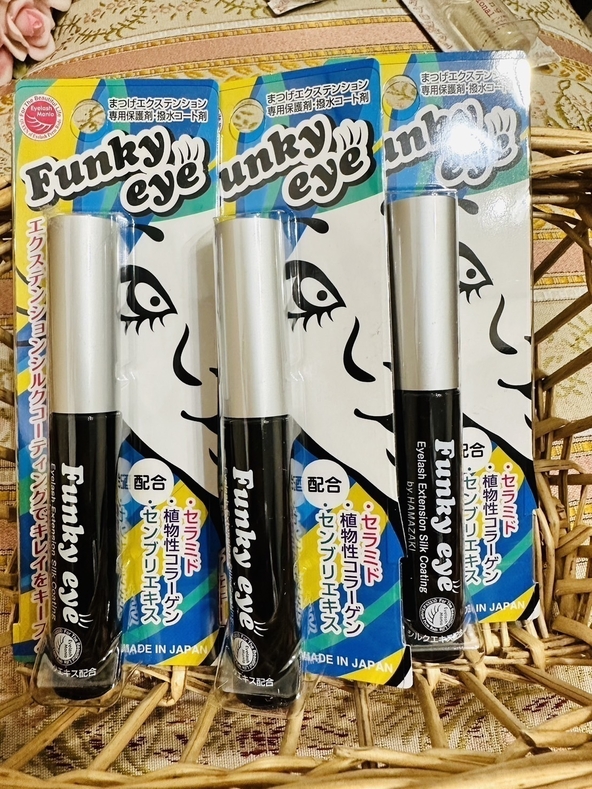 まつ毛エクステンション専用保護剤・撥水コート・高密度微粒子のシルクコーティング マツエクの持ちがアップ! まつ毛エクステンション専用保護剤で、お風呂やスポーツでかいた汗など、 水分から保護してくれるので、マツエクの持ちも期待出来ます。 ファンキーアイは、マスカラタイプのブラックコーティング剤です。 マスカラを塗った時のようなツヤがあり、コーティング剤なのにお湯でオフ出来るのでこする必要がありません♪ 施術後にお買い求めいただけます(^^)