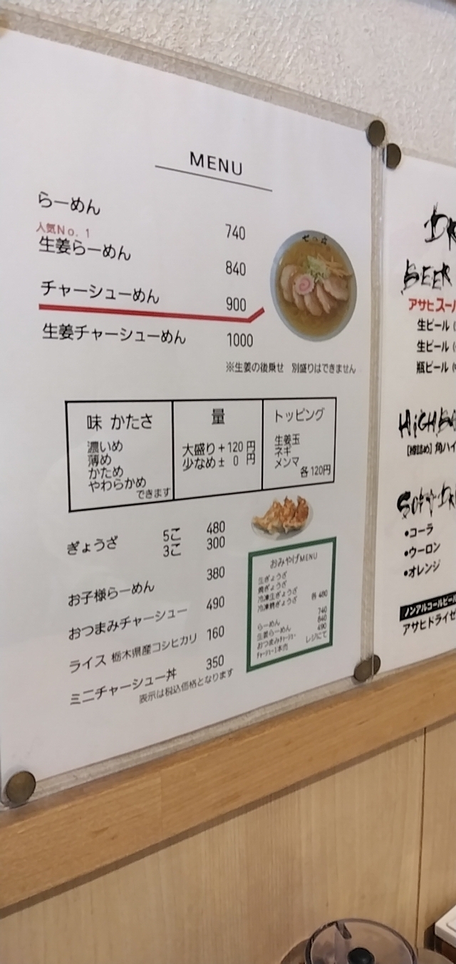 お盆休みの夕方に初めて訪れました。カウンター席と卓子席で、既に結構賑わっています。ラーメンは4種のみ(らーめん・生姜らーめん(人気No.1)・チャーシューめん・生姜チャーシューめん)で、人気一番の生姜らーめんを注文。到来した丼は熱々で、底まで透けて見えそうな淡黄色の清湯(醤油ベース)に佐野ラーメン特有の平打ち縮れ麺(手もみ済、180g)が浸っています。具は生姜玉、約5mm厚の豚バラ叉焼2枚、ナルト1枚、メンマに青ネギ。生姜玉をバラして清湯内に拡げて食すと、特有の刺激・辛味で食欲も向上します。鶏ガラと節系の出汁が感じられる清湯はやや塩っぱさが強い感じで、完飲とはなりませんでしたが、あっさりしていて実に美味しいです。