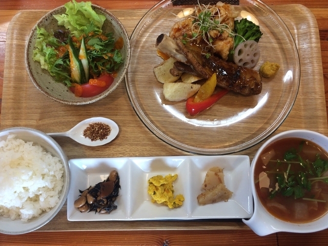 筑波山ふもと、北条大池目の前にある彩食工房ひるくらいむ。自転車専用道「りんりんロード」も近く、サイクリストからも大人気の洋食店です。ココはまるでペンションを訪れたようなあたたかいおもてなしとぬくもりがあります。掲載のランチは「柔らかリブ定食」。人気の秘密はリブの極上な柔らかさ♪お箸でも身がホロっと取れ、しかもジューシー!日によって変わるもう一品は茨城地酒「来福」の酒かすをつかったポーク♪食欲をそそるお酒の程よい香りと甘みで、お箸がとまりません。セットには地元で取れたお米とおひたし3つ、シャキシャキサラダ、スープ付き!日替で内容は若干変更があります。絶品ランチをぜひおためしあれ♪