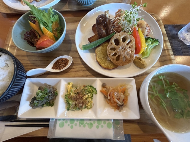 リブとチキンフリッターのランチを頂きました。お一人で作っているので時間がかかりますが、カウンター席だったので調理の様子を覗いたり、窓からは筑波山の素晴らしい眺めで飽きません。リブは勝手にバリッとかぶりつく系を想像していたら、まさかの柔らかさ!それはそれで美味しかったです。サラダや小鉢で野菜がたっぷり食べられて満足でした。 星1つ足りないのは、駐車場の難易度が高いのとスリッパの汚れが気になったので。