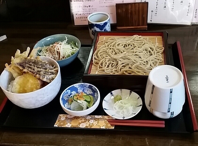 昼限定メニューのランチ。 ◆野菜天丼定食900円 そばは、常陸秋そばのニハ。 細麺でやわらかめ。 野菜天丼(カボチャ、ナス、 かき揚げの3種) サラダ、漬物のセット。