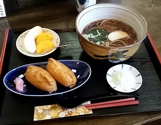 お手頃そば定食が豊富 八楽 二度目の訪問。 ◆いなりセット900円 かけそば、いなり2個、 フルーツのセット。 そばは、常陸秋そばの中細麺。 田舎そば風でこしがあるタイプ。 汁は辛口。 いなりは、おおきめの、 薄味タイプ。